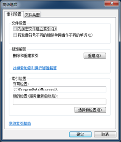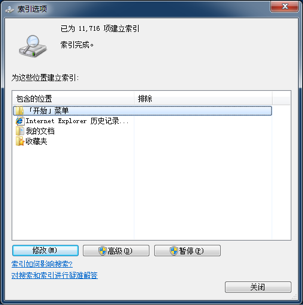 而后要配置 “索引选项”。在控制面板中找到 “索引选项” 并点击,会跳出 “索引选项” 对话框: